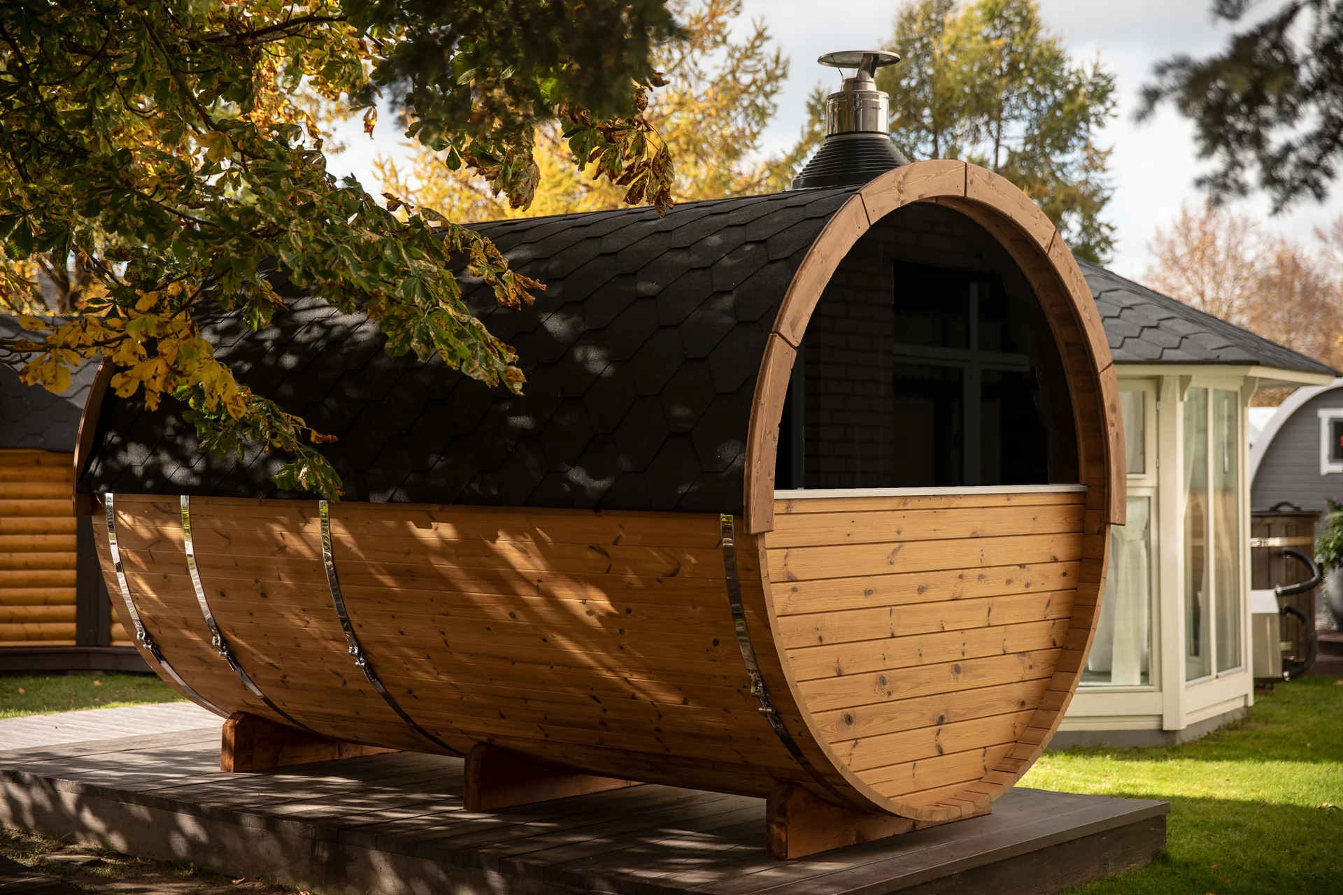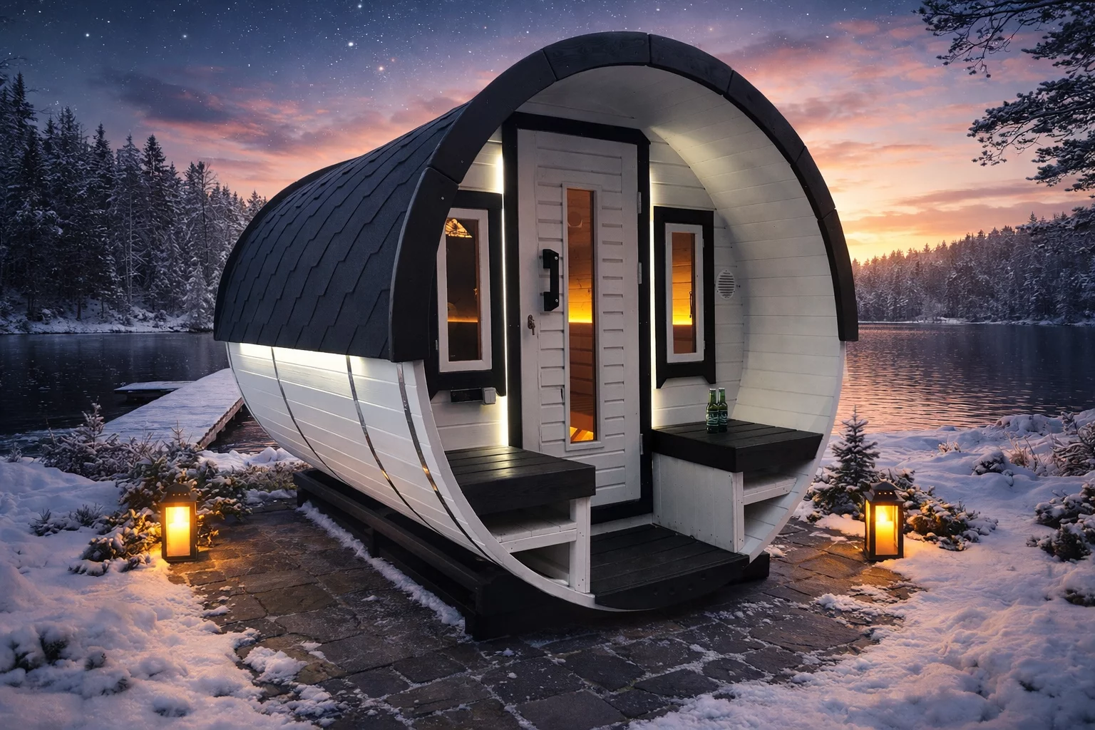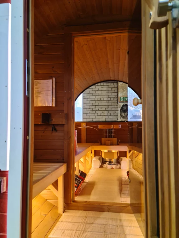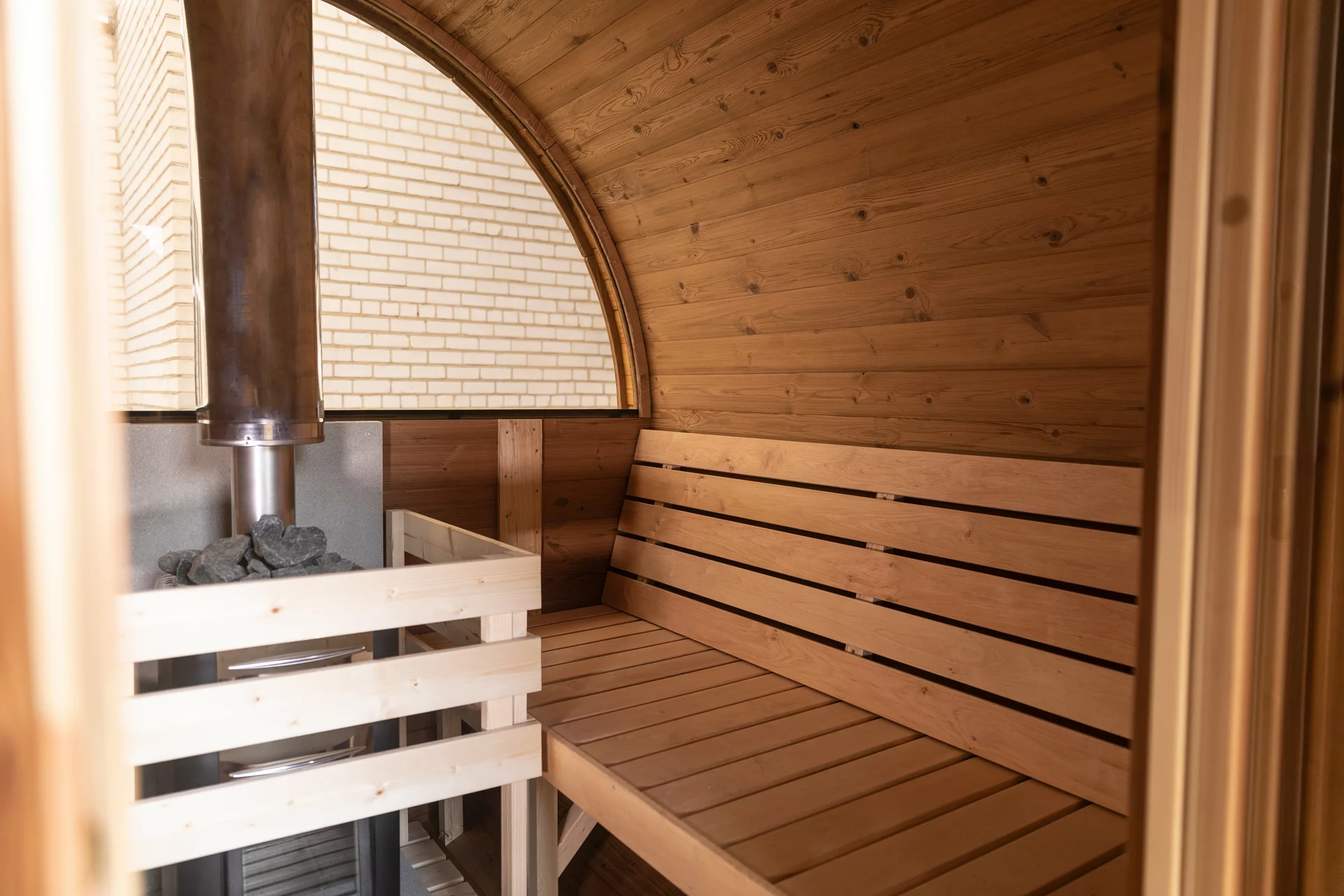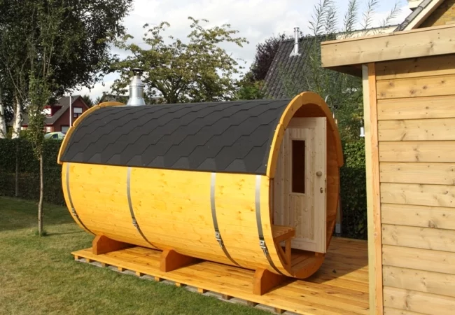 Fasssauna aus hochwertigem Fichtenholz mit massiver 38 mm Wandstärke für hervorragende Wärmespeicherung. Bequeme Rückenlehnen links und rechts bieten hohen Sitz- und Liegekomfort. Die abschließbare Holztür mit integrierter Glasscheibe sowie die Halbglas-Rückwand sorgen für eine helle Atmosphäre und einen sagenhaften Ausblick.